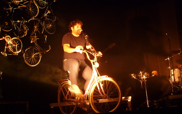 Cuando llegamos al Arteria Paral.lel la noche del sábado quedamos algo sorprendidos al encontrarnos el teatro lleno de butacas y el escenario cuidadosamente preparado con una maraña de bicicletas colgadas de las paredes. Los mallorquines quisieron que escucháramos sentados los cuarenta temas que conforman su último disco Voste es aquí y, si en un principio acogí su propuesta con cierto recelo, pronto me di cuenta de lo acertado de su decisión. El último disco de Antonia Font requiere de atención. No porque sea rebuscado ─las melodías de Joan Miquel Oliver siguen haciéndose querer─ sino porque al ser tan cortas las canciones que lo integran (la media de duración no sobrepasa el minuto y medio), no dejan lugar para la distracción ni la escucha superficial: si no atiendes, corres el riesgo de descubrir su esencia cuando ya se te ha escurrido entre los dedos.